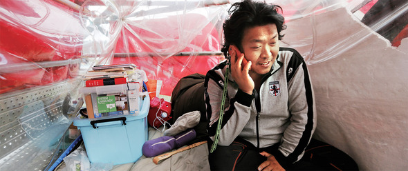 현대자동차 사내하청 해고노동자 최병승씨가 지난 5월1일 고공농성 중인 울산 북구 현대자동차 명촌중문 앞 철탑 위에서 전화 통화를 하고 있다. 2011년 2월 대법원이 최씨에게 ‘정규직 인정’ 판결을 내리자 현대차는 그해 3월 헌법소원을 제기했다. 한겨레 김명진 기자