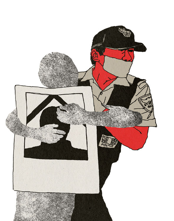 지난 6월10일 대통령은 항쟁의 정신을 이어받아 민주주의를 발전시키자고 했다. 그런데 같은 시간, 서울시청 바깥 대한문에선 쌍용자동차 해고노동자, 신부, 시민이 짐승처럼 맞으면서 경찰에 끌려갔다. 분향소가 있던 자리에 화단을 설치한 것도 모자라, 비닐몇 장으로 둘러친 농성장조차 말끔히 청소하기 위해서였다. 5·16 쿠데타 기념식이 있는 날이었으면 비웃고 말았을 것이다. 그런데 하.물.며. 민주주의와 항쟁이라는 말을 쓰면서, 하나님 (신천지) 맙소사! 잡혀간 쌍용차 노조 김정우 지부장은 구속됐다. 같은 날 경찰은 신문지를 깔고 노상에서 잠든 고동민 조합원의 사지를 들어, 신문지를 빼앗아 찢어버리면서 말했다고 한다. “야간에 노상에서 누워 있으면 불법 집회다.” 청와대·검찰·법원·구청이 나서 보이지 않는 사람 취급한다. 더 나아가 경찰은 그들이 눈앞에서 사라지기를 노골적으로 원한다.
