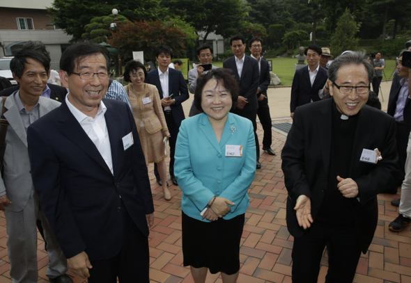 서울 정릉동에 김근태 기념 치유센터 ‘숨’이 문을 열었다. 지난 6월25일 개소식에 참여한 박원순 서울시장, 인재근 민주당 의원, 함세웅 신부가 웃고 있다(왼쪽부터).한겨레 김창광