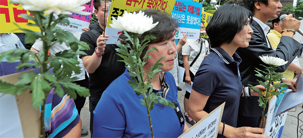 편의점 가맹점주들이 지난 6월17일 스스로 목숨을 끊은 한 가맹점주를 추모하며 본사에 과도한 밀어내기 관행 등을 개선하라고 촉구하고 있다. 이들의 요구는 6월 임시국회에서 ‘프랜차이즈법’이 통과된 덕에 일부 실현될 가능성 이 높아졌다. 그러나 다른 경제민주화 법안 대부분은 국회의 문턱을 넘지 못했다.한겨레 김정효