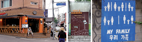 진입하는 입구(가운데 사진)가 따로 있는 ‘고여 있는’ 동네 해방촌은 보통의 삶을 사는 사람들의 공간이다.다양한 사람들이 모여 있다보니 때때로 동네 입구의 벽에는 자신의 주장을 표현하는 그림이 그려지기도 한다. 다양한 형태의 가족을 인정하자는 이 그림(세 번째 사진)은 동네에서 한 차례 갑론을박 논쟁을 일으킨 뒤 지금은 사라졌다.