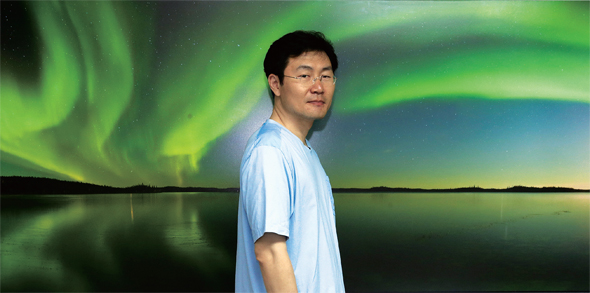 자신이 찍은 오로라 사진 앞에 선 천체사진가 권오철씨. 좋은 천체사진을 찍는 비결과 관련해 그는 “오직 노력만 믿을 뿐 우연이나 횡재는 믿지 않는다”고 말한다. 김명진