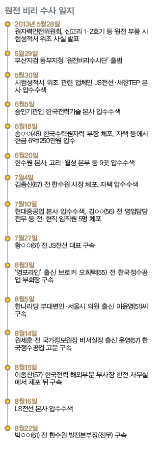 한수원 부장 집에서 발견된 6억원 현금 다발 고위급이 직접 금품을 챙기기도 했다. 김종신 전 한수원 사장은 원전 용수 처리업체인 한국정수공업의 이아무개(75) 대표로부터 각종 계약과 관련한 편의를 제공해달라는 청탁과 함께 현직 사장으로 있던 2009년 7월부터 반년 가까이 모두 5차례에 걸쳐 500만~5천만원씩 1억3천만원을 받은 혐의로 구속됐다. 그는 식당에서 5만원권 지폐를 담은 생수나 와인 상자를 직접 건네받는 식으로 금품을 챙긴 것으로 알려졌다. 당시 김 전 사장과 함께 근무했던 박아무개(61) 한수원 전 전무도 같은 업체에서 입찰 편의를 봐달라는 청탁과 함께 1억3천만원을 받은 혐의로 구속됐다. 한국정수공업은 2002년부터 10년 넘게 한수원의 원전 용수 처리시설 사업을 맡아온 업체로, UAE 바라카 원전 1∼4호기 건설에도 참여했다. 원전비리수사단의 남은 과제는 한수원·한전 고위급까지 받은 원전 납품업체의 돈다발이 어디까지 흘러들어 갔는지를 밝히는 것이 됐다. 실제로 수사의 방향은 이명박 정부 시절 권력 실세로 꼽혔던 이른바 ‘영포라인’(영일·포항 출신)으로 옮겨붙는 양상이다. 현재 그 중심에는 한국정수공업에서 부회장으로 근무했던 오희택(55·구속)씨가 있다. 그는 영포라인 출신으로 한국정수공업의 이 대표에게 “UAE 공사 계약을 하려면 박영준(53) 전 지식경제부 차관에게 돈을 줘야 한다”는 명목으로 모두 13억원을 받아낸 것으로 알려졌다. 이 돈의 일부는 박 전 차관의 측근으로 한나라당 부대변인과 서울시 의원을 지낸 이윤영(51·구속)씨에게 전달된 것으로 알려졌다. 오씨는 또 이 대표에게 “경쟁 업체인 한전KPS 임원을 교체하려면 최중경(57) 전 지식경제부 장관에게 로비를 해야 한다”면서 5천만원을 받아 김만복(67) 전 국정원장의 비서실장(2급)을 지낸 윤영(57·구속) 한국정수공업 고문에게 건넨 것으로 검찰은 보고 있다. 당사자들은 금품 로비 사실을 부인하고 있지만, 검찰이 파악한 한국정수공업의 로비 액수는 80억원에 이르고 있다. 현재 원전비리수사단은 추가 수사 의뢰를 받은 내용을 합해 8월 말까지 수사를 완료하는 것을 목표로 삼고 있다. 수사를 마무리 지으려면 민간인 불법사찰을 지시한 혐의 등으로 기소돼 징역 2년을 선고받고 현재 서울구치소에 수감돼 있는 박영준 전 차관을 소환해 조사하는 과정이 불가피할 것으로 보고 있다. 이 과정에서 또 다른 ‘몸통’이 나타난다면, ‘원전 게이트’급으로 수사 규모가 확대될 가능성도 있다. 새누리당 “원전비리 과징금 50억원으로 확대” 이처럼 검찰의 원전 비리 수사가 이어지는 가운데 새누리당 에너지특별위원회는 지난 8월21일 산업통상자원부와 당정 협의를 열어, 정부의 제2차 에너지기본계획에 대한 의견을 조율했다. 에너지특위는 이날 연료비 연동제와 주택용 누진제 축소 등을 언급한 전기요금 체제 개편과 함께 원전 비리 방지를 위한 후속 대책도 언급했다. 새누리당이 내놓은 방안은 “원전 비리와 관련한 형사처벌을 강화하고, 과징금을 현행 최고 5천만원에서 50억원으로 올리겠다”는 내용이 담겨 있었다. 앞으로 원전업계에서 수십억원이 오고가고 수십억원을 과징금으로 물렸다는 소식을 듣지 않으려면 검찰이 풀어야 할 과제가 막중하다. 김성환 기자 hwany@hani.co.kr