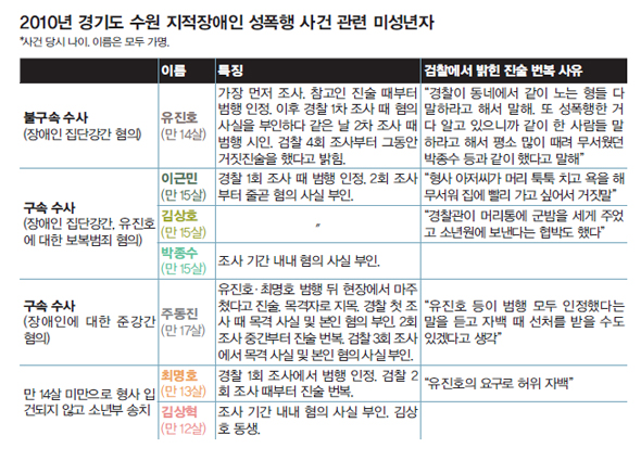 이번 사건에서 흥미로운 부분은 조사 과정에서 보호자가 동석하더라도 반드시 아이들의 방어권에 도움이 되는 건 아니라는 사실이다. 법적 지식이 없는 보호자가 선처를 바라며 혐의를 부인하는 아이들에게 사실관계를 추궁하기도 한다. 이기수 박사는 “사회적 약자가 조사를 받을 때 법률 전문가가 동석하지 않으면 큰 도움이 되지 않는다”며 “미성년자나 지적장애인 등에게는 수사 단계에서부터 국가가 의무적으로 국선변호인을 붙여줄 필요가 있다”고 말했다. 이 박사는 또 “수사 과정에서 자백이나 진술에 집착하는 건 조서 중심 재판이 계속되고 있기 때문”이라며 “모든 수사 과정을 녹음 등 기록으로 남기는 방향으로 가는 게 맞다”고 지적했다.