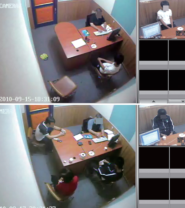2010년 9월15일 이근민이 경찰 조사를 받는 모습. 신뢰관계자의 동석 없이 혼자 조사를 받았다(위). 9월17일 피의자 신문 조사를 받던 유진호는 앞서 참고인 진술에서 자백한 내용을 3시간가량 부인했으나 조서에는 이런 정황이 잘 드러나지 않는다(아래).