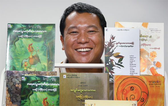 지난 8월27일 어린이교육 지원단체 ‘따비에’의 노력으로 번역된 한국 동화들을 세워두고 마웅저가 밝게 웃고 있다.