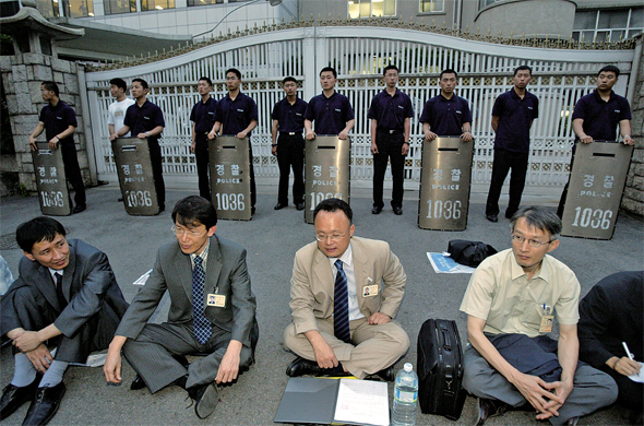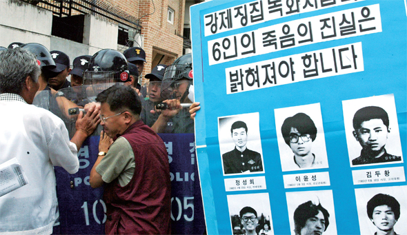 2004년 6월 서울 종로구 국군기무사령부 앞에서 의문사진상규명위원회 위원들이 녹화사업, 군 관련 사망사건 보고서 등 관련 자료에 대한 실지조사를 요구하며 농성을 벌이고 있다.한겨레 자료