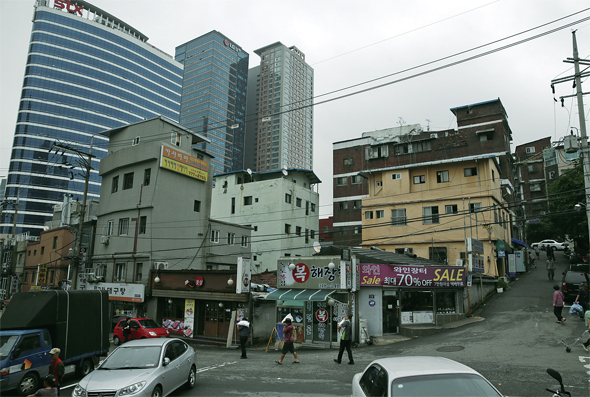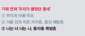 이토록 드라마틱한 변화가 서울에 또 있을까. 고층 빌딩이 동자동을 병풍처럼 둘러치고 있다. 서울역 방향을 막아선 벽산빌딩, 건너편 서울시티타워와 STX 건물, 동네의 정면을 가리는 센트레빌 아스테리움 주상복합단지, 30층은 가뿐히 넘는 빌딩들 뒤에 700여 가구 1천여 명 주민이 서울역에서 보면 마치 없는 마을처럼 동자동에 모여산다. 그리고 여기엔 주민공동체 ‘동자동 사랑방’이 있다.