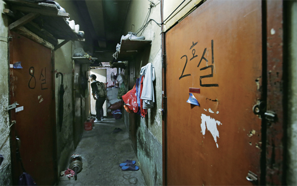 복도 양쪽에 1.5평 쪽방들이 줄지어 있는 건물은 지은 지 40~50년이 됐다. 쪽방촌 옆방은 아파트 옆집보다 부딪칠 일이 잦다. 혼자 사는 이가 많은 곳에서 이웃을 돕는 이들도 있다.