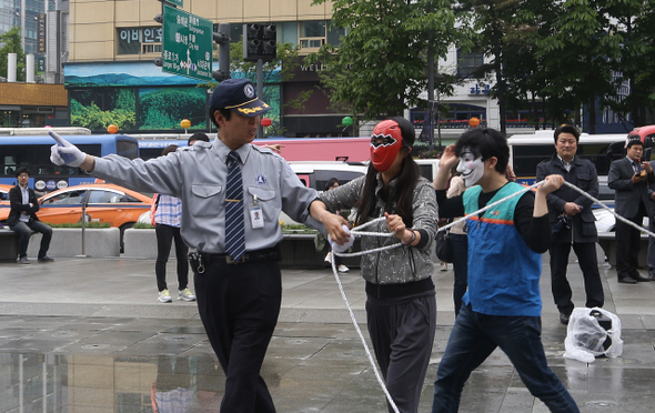 문화연대 회원들이 9일 오후 서울 광화문광장에서 표현의 자유를 위한 플래시몹을 하고 있다. 문화연대는 ‘대법원이 2010년 한 단체의 플래시몹을 정치적 집회로 보고, 집회신고를 하지 않은 불법집회로 규정했다‘며 정치적 행위와 예술행위를 구분지어선 안된다는 뜻으로 이 플래시몹을 기획했다. 관리인이 이들이 플래시몹을 하던 도중 허가를 받고 오라며 제지하고 있다. 신소영 기자 viator@hani.co.kr