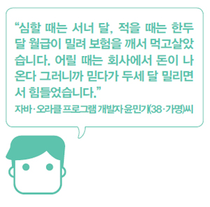 윤민기(38·가명)씨는 자바·오라클 프로그램 개발자다. 경력 10년차인 그는 한때 IT 업체 직원이었다. 대기업 사업을 맡는 중견업체로부터 하청을 받아 일하는 50명이 채 안 되는 규모의 회사였다. “심할 때는 서너 달, 적을 때는 한두 달 월급이 밀려 보험을 깨서 먹고살았습니다. 어릴 때는 회사에서 돈이 나온다 그러니까 믿다가 두세 달 밀리면서 힘들었습니다. 프리랜서는 보통 월급이 안 들어오면 계약 해지로 간주하고 바로 회사를 나가니까 (그때는) 그런 게 좋아 보였습니다. 정규직은 월급이 안 들어와도 못 나가니까.”
