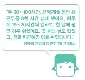은행 전산거래 시스템을 만드는 정규직 개발자였던 강민주(26·가명)씨는 얼마 전 수술을 받았다. “주 80~100시간, 2년6개월 동안 총근무를 8천 시간 넘게 했어요. 하루에 15~20시간씩 일하고, 한 달에 평균 하루 쉬었어요. 못 쉬는 날도 있었고, 정말 피곤하면 이틀 쉬었습니다. 그렇게 일하다보니 면역력이 떨어지면서 폐를 잘라내고 그때서야 알았죠. 내가 이렇게 일할 게 아니었는데 과로 때문에 병원에 왔구나. 주치의(산업의료 전문의)도 제 기록을 보고 과로 때문이라고 했어요.”