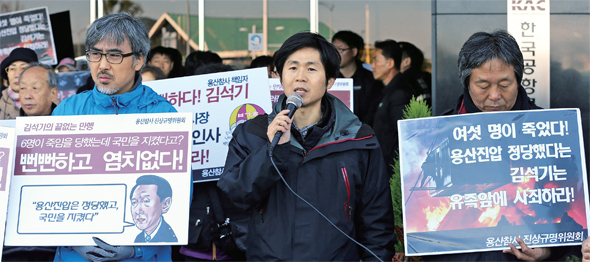 박래군 ‘인권중심 사람’ 소장(맨 오른쪽)이 지난 10월16일 서울 과해동 한국공항공사 앞에서 김석기 사장 취임을 반대하는 회견을 하고 있다.한겨레 박종식