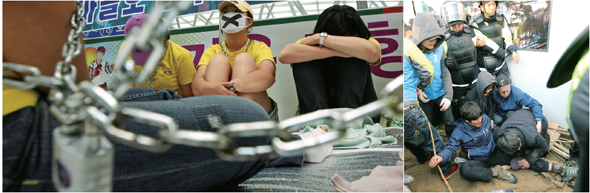 수많은 인권활동가들의 분투에도 우리의 인권은 얼마나 초라한가. 2008년 9월 몸에 쇠사슬을 두른 채 한국철도공사의 직접고용을 요구하며 농성 중인 KTX 여승무원들(왼쪽)과, 지난 4월 서울 중구 대한문 앞에서 경찰의 농성장 강제 철거에 저항하는 쌍용자동차 해고노동자들.한겨레 자료