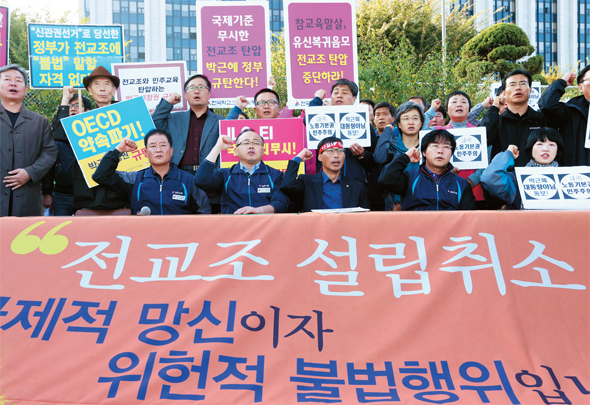 험난함 예고된 ‘생존 투쟁’ 박진보 전교조 정책교섭국장은 “단체협약의 효력은 법적인 다툼의 소지가 있다. 협약의 주체가 법적으로 사라졌다고 보면 무효라고 주장할 수 있고, 민간 차원의 계약으로 보거나 노동자의 당연한 법적 권리로 보면 유효하다고 주장할 수 있다. 전례가 없는 일이어서 정부도 고민 중인 것으로 안다”고 설명했다. 당장 전교조의 운명은 단협 상대방인 교육부나 시·도교육청의 재량에 달려 있다. 경기·강원·광주·전남·전북 등 진보 성향 교육감들은 ‘전교조를 교원단체로 존중하겠다’는 뜻을 밝혔지만 교육부와의 마찰이 예상된다. 이런 상황은 전교조의 미래가 다시 한번 정치 게임 국면으로 넘어간다는 것을 뜻한다. 전교조는 교육 현안 투쟁을 더 거세게 밀어붙인다는 방침이지만 ‘생존 투쟁’의 부담은 그보다 무겁게 전교조를 짓누를 것이다. 교원노조법이 엄연한 상황에서도 노조 설립 취소를 강행한 정부의 독단이, 1500명의 교사가 해직됐던 비합법 시절만 못하진 않으리란 전망이 우세하다. 서울 지역의 한 조합원은 “교육 관련 현안이 많은데 우리 코가 석 자다보니 손도 못 대지 않겠나. 학교 운영이 팍팍해지겠고 일제고사도 다시 시행될지 모른다”라고 안타까워했다. 공은 일단 사법부로 넘어갔다. 전교조는 정부의 법외노조 통보 뒤 곧바로 서울행정법원에 노조취소 행정집행정지 신청과 취소 소송을 냈다. 정부의 주장처럼 노동조합 및 노동관계조정법 시행령 규정으로 상위법이 인정한 노조의 지위를 박탈하는 것이 타당한지를 묻는 것이 쟁점이다. 46명의 변호사가 ‘전교조 설립취소 대응 법률지원단’(단장 김선수 민주사회를위한변호사모임 변호사)에 참여했다. 해당 시행령을 두고 전교조가 제기한 헌법소원 결과도 아직 나오지 않았다. 이같은 ‘사태의 장기화’야말로 정권의 노림수라는 지적이 나온다. 국가정보원과 군의 대선 개입 의혹이 꼬리를 무는 가운데, 정부가 전교조를 제물 삼아 정국의 주도권을 쥘 것이라는 전망이다. 한상희 건국대 교수(법학)는 “전교조를 법외노조화한 것보다는, 그로부터 파생될 다툼이 노동계와 시민사회, 정계에 두루 영향을 미칠 것”이라고 설명했다. “전교조가 집단행동에 나서면 그때마다 정부가 ‘교육 현장이 망가진다’며 진보 진영의 민주적인 요구들을 탄압하고 공안 정국을 조성해나갈 여지가 생겼다. 전교조 법외노조화는 현 정부가 그린 아주 큰 정치적 그림의 단초로 보인다.” 10년의 비합법 시절, 14년의 합법 시절을 거친 전교조에 ‘법외노조’는 또 다른 시작이다. ‘필사즉생 필생즉사’. 김정훈 전교조 위원장은 노동부의 법외노조 통보에 이같은 손팻말을 들고 “오늘은 유신 부활의 신호탄이다. 끝까지 투쟁하겠다”고 말했다. 이영주 전교조 수석부위원장은 “14년 합법노조를 마치지만 새로운 자유, 민주주의로 가는 길을 열었다. 전교조에 제3의 시작”이라고 설명했다. 노동계는 다시 가장 낮은 곳에서 출발하는 전교조의 ‘쇄신’을 환영하고 지지하는 분위기다. “이건 아니다” 새로 조합원이 된 교사들 전교조의 싸움이 쓸쓸하지만은 않을 것으로 보인다. 국제사회의 눈길이 한국 정부에 쏠리고 있다. 12월 하순에는 한국의 노동기본권 탄압 상황을 조사하기 위해 국제공동조사단이 한국에 온다. 세계교원단체총연맹(EI), 국제노동조합총연맹(ITUC) 등 교육·노동 관련 국제단체가 참여한다. 조합원이 이탈할 것이라는 우려와 반대로, 새로 가입하는 조합원도 늘고 있다. 이현웅(29) 전북 금과초교 교사는 지난달 정부의 법외노조 방침이 보도된 뒤 전교조에 새로 가입했다. “이미 인권위나 국제 노동단체 등에서도 개선해야 한다고 한 법 조항을 들어 새삼스럽게 문제 삼는다는 게 말이 안 된다고 생각돼 힘을 보태고 싶었다”고 이 교사는 말했다. 탈퇴했던 전교조에 지난 9월 재가입한 서울 지역 조합원 ㄴ(37) 교사도 마찬가지다. “정권의 입맛에 맞지 않는다고 30년 역사의 노조를 꼬투리 잡아 없애려 하는 걸 보고 참을 수 없었다.” 지난 한 달, 법외노조의 부담을 무릅쓰고 전교조에 새로 가입하거나 재가입한 조합원은 모두 128명이다. 전교조를 상대로 다시 한번 ‘손해 본 적 없는 장사’를 시작한 정부의 손익계산서가 나오기까지, 결과는 아직 지켜볼 일이다. 엄지원 기자 umkija@hani.o.kr