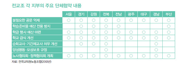 변화는 학생들의 일상과 밀접하다. 전교조는 두발·복장 규정과 같은 학생 인권 보장 조처, ‘학습준비물’ 예산 전용 금지 등 학교 투명화 방안을 단협에 포함하고 있다. 아울러 일부 지부는 학급 내 행사 진행비를 별도 예산으로 마련하도록 단협으로 약속받고 있지만, 이 또한 효력을 잃을 것으로 보인다. 교육청의 독주를 막고 현장의 의견을 반영하기 위한 정책협의회(노사협의회)를 보장하고 있는 것도 단협이다. 서울·경기 등 9개 지부의 단협에 해당 조항이 포함돼 있다. 지난해 전북도교육청은 전교조 전북지부와의 정책협의회를 통해 일선 학교의 교무회의를 의결기구화하는 방안을 추진했다. ‘교장님 지시사항 전달을 위한 시간에 지나지 않는다’는 지적을 들어온 교무회의에 좀더 민주적인 참여와 소통을 담보하기 위한 것이었다.