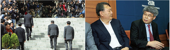 현대자동차 비자금 사건으로 수사를 받게 된 정몽구 현대차 회장(가운데 뒷모습)이 2006년 4월24일 대검찰청 중앙수사부에 출석하고 있다(왼쪽). 지난 6월14일 국가정보원 대선 개입 사건의 수사 결과를 발표하기 위해 서울고검 기자실을 찾은 이진한 서울중앙지검 2차장검사(오른쪽)와 윤석열 특별수사팀장이 서로 빤히 쳐다보고 있다.한겨레 김태형, 박종식