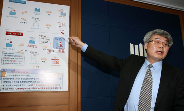 이진한 서울중앙지검 2차장검사가 15일 오후 서울고등검찰청 기자실에서 남북정상회담 회의록 폐기 의혹과 관련한 수사결과를 발표하고 있다.류우종 기자 wjryu@hani.co.kr