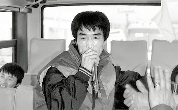 두산중공업은 2002년 파업으로 인한 손해배상액 65억원을 청구하고 임금 53억원을 가압류했다. 고 배달호씨는 이런 악랄한 노동탄압 사실을 유서에 남기고 분신했다. 1993년께 어느 노동조합 행사에 참여한 고 배달호씨가 버스 안에서 마이크를 잡고 있다.후마니타스 제공