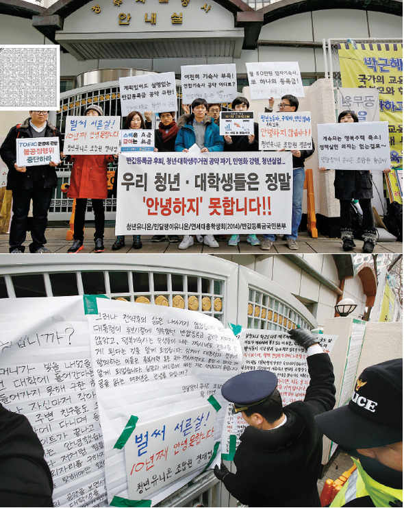 민달팽이유니온, 청년유니온, 연세대 총학생회, 반값등록금국민본부 소속 청년들이 12월18일 서울 광화문 정부서울청사 후문에서 ‘안녕하지 못합니다’란 플래카드를 들고 반값 등록금 후퇴와 청년·대학생 주거권 공약 파기 등을 비판하고 있다(위). 이 단체들이 청사 후문에 대자보를 붙이자 10여 분 만에 청사 경비직원이 떼어내고 있다(아래).