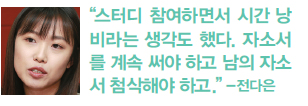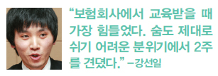 강- 생명보험회사에서 교육받을 때 가장 힘들었다. 숨도 제대로 쉬기 어려운 분위기에서 2주간 교육받았다. 야간자율학습까지 하느라 아버지 생신 모임, 취업 OTL 기획회의에도 못 갔다. 취업이 뭐길래 이렇게 자존심까지 내팽개쳐야 하는 걸까 싶었다.