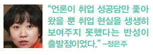 정- 첫 회 편집자주에서 ‘아름다운 도전기’를 담겠다고 썼다. 아름다운 도전기란 합격기를 의미하는 게 아니었다. 그땐 이미 취업 실패담이라는 게 확실해져서. (웃음) 지난 6개월간 불안 속에서도 자기 꿈을 향해 도전해온 전다은·강선일·나해리씨가 아름답다고 나는 생각했다. 연봉도 높지 않고 노동강도도 세지만 기자라는 하고 싶은 일을 향해 뚜벅뚜벅 걸어가는 모습이 그랬다. 두렵지만 용기를 낸 덕분에 올해 취업 OTL을 썼고 내년엔 길벗출판사에서 책을 낸다. 새로운 길을 개척하는 취준생을 더 만나겠다.