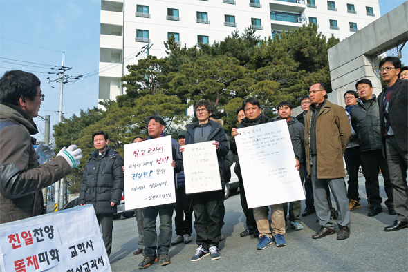 지난 1월5일 전북 전주 상산고 정문 앞에서 졸업생 동문과 시민들이 교학사 한국사 교과서의 채택 철회를 요구하는 집회를 벌이고 있다.한겨레 박임근