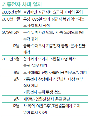 노조도 한 걸음 양보했다. 생산설비가 없는 회사 상황을 고려해 고용 시점을 1년6개월 미뤄주었다. 약속한 복직 시점인 2012년 5월, 노조는 다시 반 걸음 물러섰다. 2011년에 매출 200억원, 영업이익 10억원의 흑자 공시를 내고도 회사는 “아직은 생산설비를 갖추는 데 내적 어려움이 있다. 반드시 설치하겠다”는 말만 거듭했다. 부속합의서에 따라 한 차례 더 유예기간을 허락했다. 2년6개월 만인 지난해 5월2일에야 기륭전자 조합원 10명은 회사에 복귀했다.