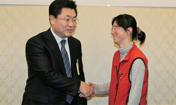 2010년 11월1일 서울 여의도 국회 본관에서 최동열 기륭전자 회장이 노조원 전원 복직을 약속하는 합의서에 서명한 뒤, 김소연 기륭전자 분회장과 악수를 나누고 있다.사진공동취재단