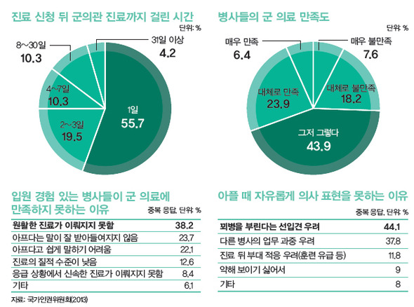 군 의료에 대한 불만은 보편적으로 나타난다. 2013년 7~11월 인권위가 사단법인 인권의학연구소에 의뢰해 훈련소 3곳, 군부대 5곳, 군병원 5곳 등을 대상으로 실시한 ‘군 의료관리 체계에 대한 인권상황 실태조사’ 결과를 보면, 군병원 입원 경험이 있는 응답자 312명 가운데 48.1%는 ‘입대 뒤 군 의료에 대한 인식이 나빠졌다’고 답했다. 군 의료에 만족하지 못하는 이유로는 ‘원활한 진료가 이뤄지지 못하기 때문’(38.2%)이라는 응답이 가장 많았다.