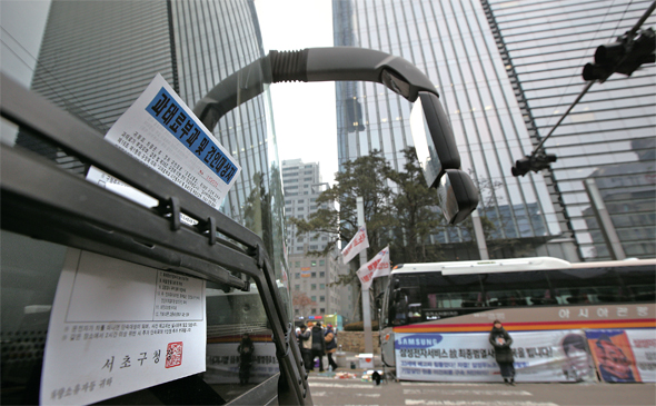 지난 1월16일 서울 강남구 역삼동 삼성 본관 앞에서 삼성 일반노조 조합원들이 매주 열리는 집회에 참가했다. 이날 삼성 쪽에서는 집회가 열리기로 돼 있던 장소에 미리 대형 버스를 주차해 과태료 부과 통지서를 받았다. 공간을 잃은 조합원들은 도로 위에서 집회를 진행했다. 한겨레 신소영