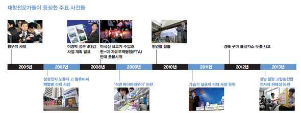 국내 대항전문가 그룹을 연구해온 김종영 경희대 교수(사회학)는 “우리 사회는 특히 많은 정책 결정이 주류인 ‘지배지식동맹’에 의해 결정된다. 지배지식동맹은 정부의 정치적 결정에서 정치적 성격을 지우고 정치적 논쟁을 피하게 만드는 중요한 정치적 파트너다. 지난 10년간 한국 사회가 직면했던 사회적·정치적 논란의 많은 부분이 전문지식과 연관돼 있다”고 설명했다. 삼성전자 반도체공장 노동자 백혈병 사망(2007), 미국산 쇠고기 수입 반대 촛불시위(2008), 4대강 사업 논쟁(2008), 천안함 침몰(2010) 등을 계기로 정부·주류지식권력과 시민·대항전문가 사이에 지식다툼이 벌어졌다.