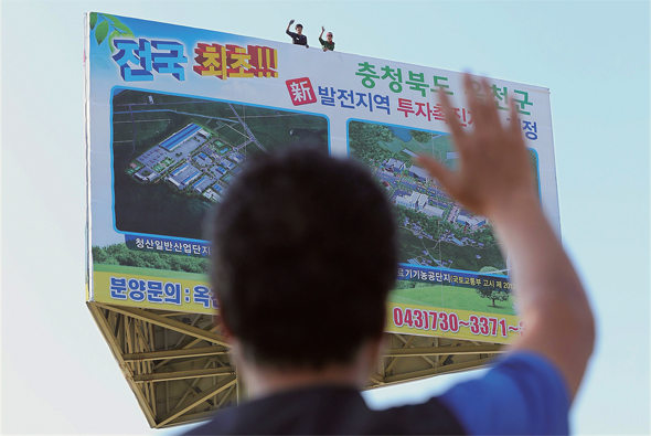 이정훈 전국금속노조 유성기업지회장(오른쪽)과 홍종인 아산공장 지회장이 지난해 10월14일 충북 옥천읍 옥각리 옥각교 옆 광고탑에 올라 유시영 유성기업 사장의 처벌을 요구하고 있다.한겨레 박종식