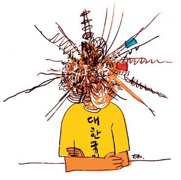 물론 이러한 특징들은, 한국이 겪은 역사적 상황을 몸소 증거하고 있기는 할 것이다. 예컨대 지하에서 건물 내벽을 따라 들어가지 못한 채, 공중에서 계속 덧대어지다가 얽혀버린 전선들은, 도시계획보다 더 빨리 진행된 도시화 혹은 그만큼 더 빠르게 건물을 세우고 부수면서 요동치는 부동산을 증거할 것이다. 또 아우성치는 간판들은 한 점포가 한자리에 꾸준히 머무르지 못하는 한국 상권의 근대적 특징, 그 역사적 조건에 대해서 증거할 것이고. 하지만 이런 고상한 역사과학적 유추를 일부러 조금만 소홀히 하고서, 거기서 한국인의 민족성을 넘겨짚는다면, 지나친 억지일까? 달리는 시간보다 주차하는 시간이 더 많아도 덩치는 커야 하는 자동차들은 우리네의 허세를 닮아 있다. 옷이 날개인 거다. 그리고 각자 너도 한마디 나도 한마디씩 하면서 우글대는 간판들은, 댓글이라면 너도나도 전문가가 되고 비평가가 되는 우리네들의 오지랖을 닮아 있다. 욕 많이 먹어야 오래 산다고, 서로 챙겨주는 걸까. 또 얽히고설킨 전선들은, 모두가 한 가족 같지만 사실은 그 안에서 경쟁과 암투, 그리고 뒷담화와 호박씨를 감내해야만 하는 우리네 한 지붕 문화를 닮아 있다. 언뜻 보면 모두가 서로에게 언니이고 오빠인 가족주의는, 사실 바로 그렇기 때문에 누구도 언니이고 오빠가 아닌 실향주의(?)일 수도 있는 게다. 가지 많은 나무 바람 잘 날 없다더니.
