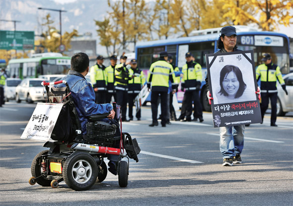 화재로 질식사한 장애여성 활동가 김주영씨의 노제를 마친 장애인들이 2012년 10월30일 ‘24시간 활동보조 보장’을 요구하며 서울 광화문 도로에서 시위를 하고 있다(아래쪽). 박경석 노들장애인야학 교장(위쪽)은 이날 시위로 200만원의 벌금을 부과받았다.