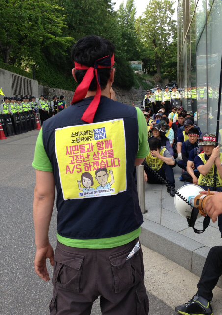 지난 5월13일 서울 용산구 한남동 ‘리움미술관’ 앞에서 삼성전자 제품 애프터서비스(AS) 기사들이 집회를 벌이고 있다. 이들은 삼성전자서비스 협력업체와 근로계약을 맺고 있지만, 실제 고용주는 삼성전자서비스라고 주장하며 지난해 금속노조 삼성전자서비스지회를 결성했다. 이들은 이날 리움미술관 근처에 있는 이재용 삼성전자 부회장 자택 앞에서도 기습시위를 벌였다.