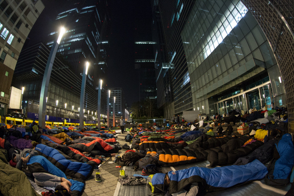 삼성전자서비스지회 조합원들이 지난 5월22일 밤 서울 서초동 삼성 본관 건물 사이 길 위에서 잠들어 있다. 염호석 양산센터 분회장이 ‘노조의 승리’를 빌며 스스로 목숨을 끊은 뒤, 노조는 19일부터 삼성 본관 앞에서 무기한 노숙농성에 들어갔다. 한겨레21 박승화 기자 eyeshoot@hani.co.kr