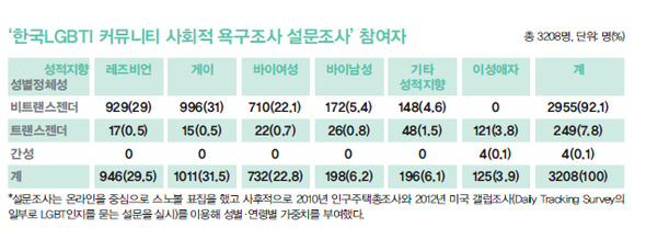 조사 작업도 기적처럼 진행됐다. 당초 1천 명 조사를 목표로 시작했지만, 소셜네트워크서비스(SNS) 등에 설문지가 공개되자 하루 만에 1천 명이 설문에 응했다. 그렇게 3208명(설문조사 3159명, 면접조사 49명)의 성소수자들이 참여한 ‘한국LGBTI 커뮤니티 사회적 욕구조사 설문조사’ 결과는 지난 5월17일, 국제 성소수자 혐오 반대의 날에 공개됐다. LGBTI를 아우르는 한국 최초의 조사이자 커뮤니티의 힘으로 만들어진 결과였다. 13~62살이 조사에 참여했고 가장 많은 비중을 차지하는 연령대는 19~24살(26.6%)이었다. 성적지향·성별정체성 분포로 보면 게이 31%, 레즈비언 29% 등이었다(표 참조). 여기엔 짐작과 다른 결과가 있었을까. 슬픈 예감은 틀린 적이 없었을까. 나영정 ‘성적지향·성별정체성연구회’ 상임연구원과 이종걸 친구사이 사무국장이 ‘LGBTI 사회적 욕구조사’에 대한 해설을 더했다.