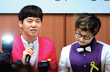 서대문구청이 혼인신고 접수를 거부하자 김조광수·김승환 커플은 지난 5월21일 서울 참여연대 느티나무홀에서 기자회견을 열어 동성부부 혼인신고 불수리 불복 소송을 제기한다고 밝혔다. 한겨레21 정용일 기자 yongil@hani.co.kr