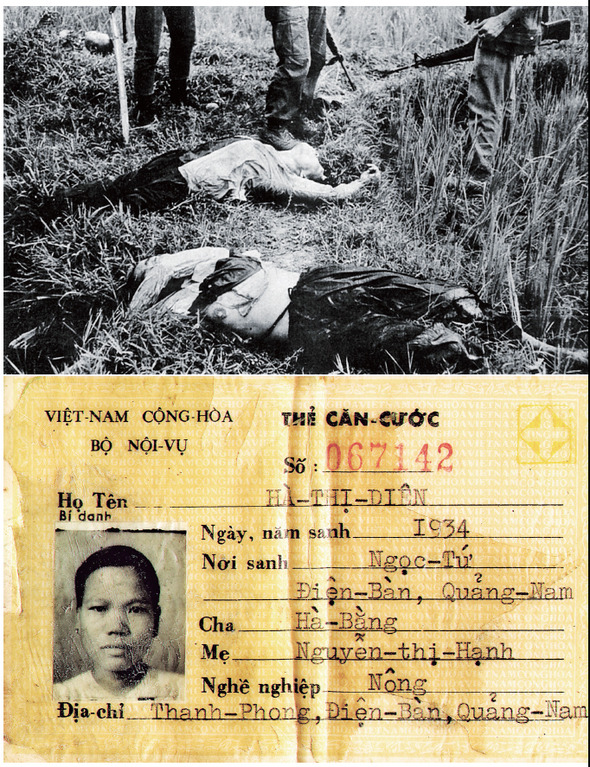 1968년 2월12일 퐁니·퐁넛 사건을 조사한 미군 보고서에 첨부된 여인들의 주검 사진. 레딘먼의 형 레딘묵은 아래 젖가슴이 드러난 여인이 자신의 어머니인 하티지엔이라고 주장했다(위). 아래 사진은 어머니 하티지엔의 신분증. 미 국립문서보관소, 레딘묵 제공