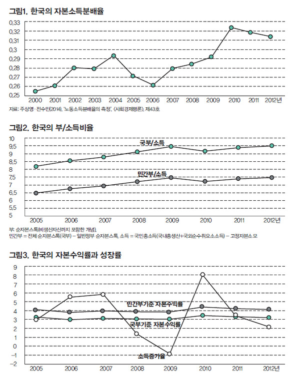 피케티가 거의 300년에 걸친 불평등의 역동적인 모습을 정리해낼 수 있도록 만든 단순하면서도 강력한 모델은 과연 어떤 것인가? 피케티 모델은 다섯 가지 경제변수들, 즉 자본소득분배율(α), 부/소득비율(β), 자본수익률(r), 저축성향(s), 국민소득증가율(g)로부터 출발한다. ‘피케티 비율’이라 부를 이 변수들에 대해 좀더 알기 쉽게 설명해보자. 생산된 소득은 자본 소유자와 노동자가 나눠 갖는다. 자본 소유자가 가져가는 몫의 비율은 자본소득분배율, 노동자가 가져가는 몫의 비율은 노동소득분배율이다. 만약 당신의 연봉이 4천만원인데 재산(부)은 2억원이라면, 부/소득비율은 5가 된다. 즉, 연봉의 5배에 해당하는 재산을 가지고 있다는 뜻이다. 그 2억원의 재산을 1년 동안 굴려 1천만원의 수익을 거뒀다면 자본수익률은 5%다. 연봉 4천만원 중에서 사용하지 않고 남은 돈이 400만원이라면 당신의 저축성향은 10%다. 만약 내년에 연봉이 4100만원으로 오른다면 소득증가율은 2.5%다. 이들 변수 사이에는 피케티가 ‘자본주의의 첫 번째 기본법칙’과 ‘두 번째 기본법칙’이라 부른 두 가지 관계가 성립한다. 먼저 α=r×β 이다. 즉, 자본소득분배율은 자본수익률에다 부/소득비율을 곱한 값이다. 이 관계는 언제나 성립한다. 자본소득/자본=(자본소득/국민소득)×(국민소득/자본). 예를 들어 자본수익률이 연간 5%이고 부/소득비율이 6이라면, 자본소득분배율은 5%×6=30%가 된다. 쉽게 말해 자본총량이 국민소득의 6배이고 자본의 평균수익률이 5%라면, 국민소득 가운데 30% 정도가 자본(가)에 돌아간다는 뜻이다. 피케티는 보통 경제학에서 자본이라고 부르지 않는 것들, 즉 개인이나 법인, 정부가 가지고 있는 금융자산 등은 물론 재화나 서비스 생산에 이용되지 않는 주거용 토지까지 ‘자본’에 포함시킨다. 한마디로 어떤 형태로든 수익을 얻을 수 있는 모든 자산을 가리키는 것이니, 전통적인 경제학적 개념으로는 오히려 부(wealth)에 가깝다. (그래서 β를 자본/소득비율이라고도 부/소득비율이라고도 부른다). 다음은 β=s/g이다. 이것은 ‘첫 번째 기본법칙’처럼 항상 성립하는 것은 아니고, 경제학에서 말하는 ‘균제상태’(steady-state)에서만 성립한다. 만약 어느 경제가 성장률 4%인 상태를 충분히 오랫동안 유지하고, 또 전체 소득 중에서 소비하지 않고 저축하는 비율 또한 20%로 안정적으로 유지된다면, 부/소득비율(β)은 20/4=5이다. 즉, 부가 소득의 5배 정도 되는 수준이 계속 유지될 것이라는 뜻이다. 경제가 항상 균제상태에 있는 것은 아니지만, 일단 균제상태에 도달하면 이 비율은 변하지 않는다. 예를 들어, 단순화해 올해 국민소득이 100이고 자본총량(부)이 500이라고 가정하자. 이때 부/소득비율은 5이다. 만약 국민소득 증가율이 4%이면 내년 소득은 104가 된다. 만약 저축률이 20%이면 올해의 자본총량 500에 20이 보태져 내년의 자본총량은 520으로 늘어난다. 따라서 내년의 부/소득비율(β)은 520/104=5가 되는데, 이것은 s/g=20/4=5와 같다. 부/소득비율이 계속 5로 유지됨을 알 수 있다. 마지막으로 피케티의 모델을 완성시키는 것은 r>g라는 부등식, 즉 자본수익률이 성장률을 웃돈다는 것이다. 사실 이 관계는 이론적으로 항상 성립하지는 않는다(물론 피케티는 대부분의 경제모델에서는 이 관계가 성립한다고 주장한다). 그런데 지난 300년의 통계자료를 분석한 피케티에 따르면, 20세기의 예외적인 기간을 제외하곤 이 부등호가 오래전부터 성립해왔다. 자본수익률이 국민소득증가율보다 크다는 것은, 자본의 소유자들이 경제 전체의 평균보다 더 빠른 속도로 이윤을 챙긴다는 것을 뜻한다. 현실적으로 자본은 소수에 집중돼 있다. 그렇다면, 쉽게 말해 부자들은 경제성장률보다 더 높은 수익률을 실현하며, 그 결과 매년 일해서 버는 소득보다는, 기존에 쌓아놓은 소득, 즉 부(재산)가 차지하는 영향력이 더 커진다. ‘땀 흘려 일해 양식을 취하는’것보다는 ‘은수저를 물고 태어나는 것’이 훨씬 더 중요해지는 셈이다. 피케티 자신은 거듭해서 부인하지만, 서구의 보수주의자들이 그의 저서 <21세기의 자본>에서 마르크스의 유령을 떠올리는 것은 이 때문이다. 성립할 수 없는데 성립하는 ‘자본수익률>성장률’ 이제 한국 경제에서 피케티 비율의 추정치를 살펴보도록 하자. 먼저 α, 즉 자본소득분배율의 추이는 <그림1>과 같다. 한국의 경우 자영업 인구가 차지하는 비중이 전체 고용인구의 30% 가까이나 돼 대체로 선진국 수준(10%)의 3배에 이른다. 자영업자의 소득을 자본소득과 노동소득으로 적절하게 나누어 계산하지 않으면 현실과는 동떨어진 결과가 나오기 쉽다. 만약 어느 치킨가게 주인이 한 달에 200만원을 벌었다면, 한국은행이 작성해 발표하는 전통적인 통계에서는 200만원 전체를 자본소득으로 간주한다. 그러나 자영업자는 자본을 소유하는 동시에 스스로 일해야 하는 노동자이기도 하다. 따라서 200만원 중 일부는 노동소득으로 계산해주어야 한다. 이렇게 자영업자의 소득을 부분적으로 보정해준 결과, 한국의 자본소득분배율은 지난 10여 년간 상승세를 보였음을 확인할 수 있다. 바꿔 말해 노동이 가져가는 몫은