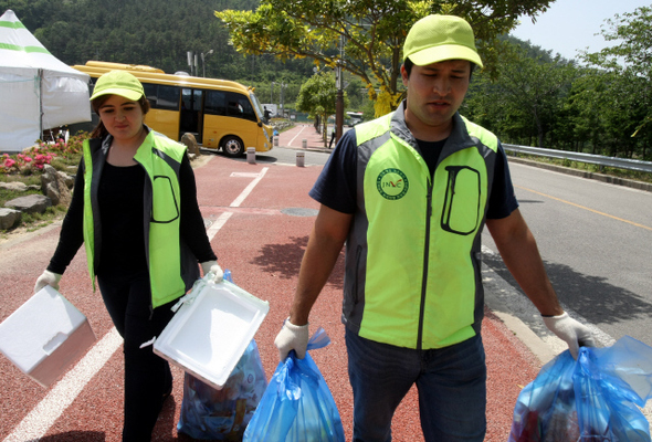 아프가니스탄 유학생 샴스 사밈(오른쪽)과 마하크 파란기스가 세월호 실종자 가족들이 머무는 전남 진도실내 체육관에서 자원봉사를 하고 있다. 샴스 사밈 제공
