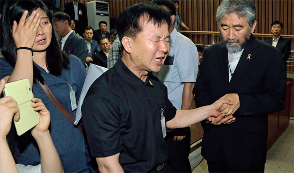 세월호 희생자 가족들이 7월2일 국회에서 열린 ‘세월호 침몰사고 진상규명 국정조사특별위원회’가 중단된 뒤 김수현 서해해양경찰청장에게 항의하며 오열하고 있다. 한겨레 이정우 선임기자