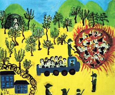 영화 <귀향>은 ‘태워지는 처녀들’이란 제목의 그림(사진)에서 출발했다. 일본군 위안부 피해자인 강일출 할머니가 2001년 미술심리치료 과정에서 그린 그림이다. 위안부로 끌려간 소녀들이 산 채로 불구덩이에 밀어넣어져 불타는 모습과, 당시 가까스로 탈출한 강 할머니의 아픈 기억이 작은 도화지에 노랑·빨간색으로 재현됐다. <귀향> 연출자인 조정래 감독은 2002년 창작 소리꾼 ‘바닥소리’의 전속 고수(북 치는 사람)로 위안부 피해자들을 위한 공연을 하면서 할머니들과 인연을 맺은 뒤 이 그림과 만났다.