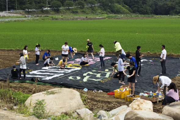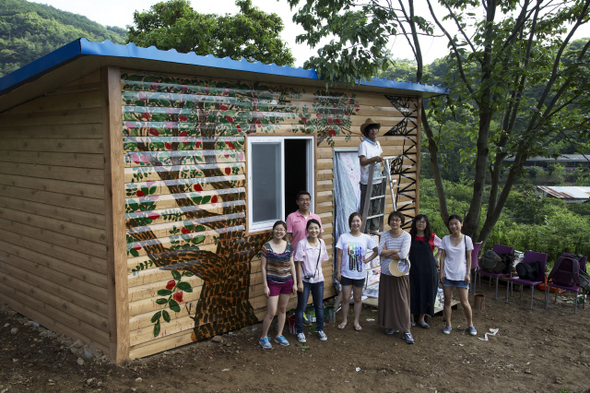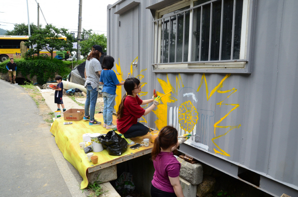 그런 할매·할배들이 다시 마음을 동여맸다. ‘우리는 다시 시작한다’라는 현수막을 마을마다 걸었다. 짓밟힌 움막보다 더 튼튼한 컨테이너를 송전탑이 지나는 4개 면 6개 마을에 하나씩 갖다놨다. 2개 마을엔 기존에 쓰던 마을 건물에 벤치도 놓고 칠도 해서 단장했다. 7월4~6일, 전국 방방곡곡은 물론 바다 건너에서 할매·할배들의 ‘재부팅’을 응원하기 위해 사람들이 모여들었다. 대구대 회화과 학생 6명, 홍익대 미술대학 학생 20여 명, 8살·10살 아이를 데리고 경남 함양에서 온 엄마, 그 엄마의 서울 사는 친구, 20대 중반 커플, 경기도 과천에서 같이 교회 다니는 6명을 비롯해 삼성전자서비스지회 조합원, 인천 공동체 기찻길옆작은학교 회원, 판화가 이윤엽, 미술가 전진경, 사진가 정택용·정운·장영식, 대만에서 원전 반대 운동을 하던 대학교수와 학생 등 60여 명이 할매·할배의 새 출발 터전이 될 회색빛 컨테이너에 알록달록 색을 입히러 왔다. ‘붓들고 투쟁’이다.