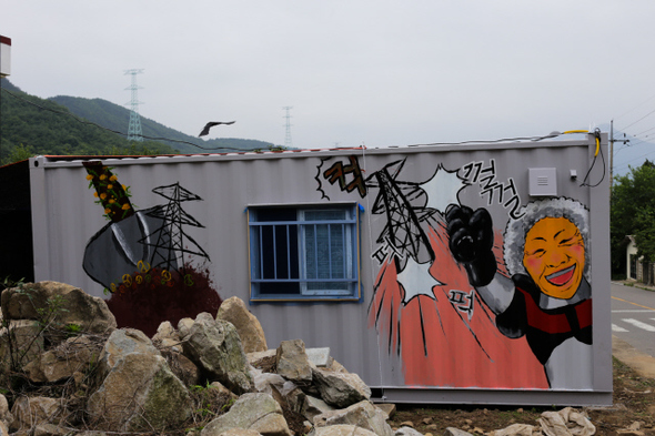 같은 시간, 상동면 고답마을에서는 대구대 회화과 학생 6명과 기찻길옆작은학교 공동체원 4명이 컨테이너에 그림을 그렸다. 이들은 할매들이 힘을 내면 좋겠다는 의미를 담아 ‘할매 마징가Z’가 송전탑을 날려버리는 그림을 그렸다. 밀양 싸움을 바라보는 이들에게 할매·할배는 대한민국 에너지 정책의 흐름에 있는 힘을 다해 제동을 걸고 있는 마징가Z다. 다른 한편으로 이미 들어선 송전탑 때문에 힘이 빠져 있을 할매들에게 기운을 북돋겠다는 의미도 있다. 7월4일 오후, 컨테이너 사랑방의 3면 가운데 2면에 마징가 할매와 ‘밀양은 희망이다’ 글과 꽃그림을 그리는 이들에게 마을 주민 박순숙(58)씨 등이 다가와 말했다. “아따, 이거는 송전탑 있어서 너무 행복한 마을 같은데. 우리 송전탑 때문에 괴롭대이.” 머리를 모은 이들은 옆면에는 쇠사슬을 휘감은 송전탑을 그렸다. 기찻길옆작은학교 회원 심혜원(19)씨는 “어르신들이 다시 오셔서 쇠사슬 송전탑을 보더니 ‘아, 이제 좋다. 우리는 저 송전탑 진짜 다 뽑아삘 끼다’ 말씀하시는데, 어르신들이 여전히 기운을 내고 밝아 보이셔서 참 다행이라고 생각했다”고 말했다.