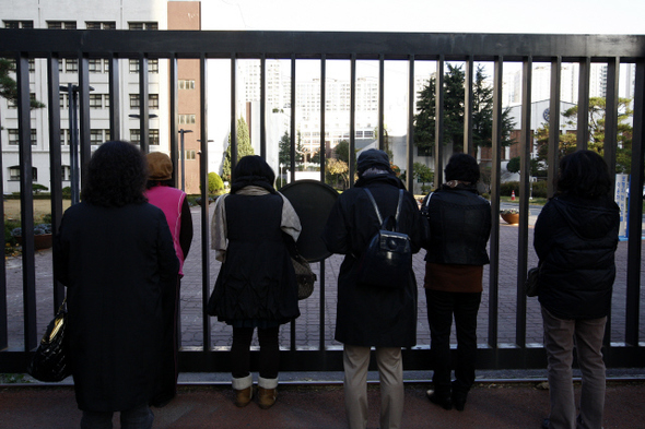 ‘2010학년도 대학수학능력시험‘이 치러진 12일 아침 서울 강남구 도곡동 숙명여고 시험장 앞에서 학부모들이 수험장을 바라보면서 기도를 하고 있다. 김명진 기자 littleprince@hani.co.kr