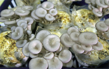 커피 찌꺼기를 섞은 버섯 배양기(배지)에서 느타리버섯이 자란 모습.