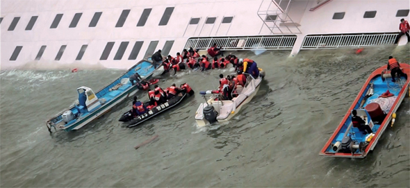 지난 4월16일 전남 진도군 관매도 인근 바다에서 좌초된 ‘세월호’에서 해양경찰 등이 승객을 구조하고 있다. 서해지방해양경찰청 제공