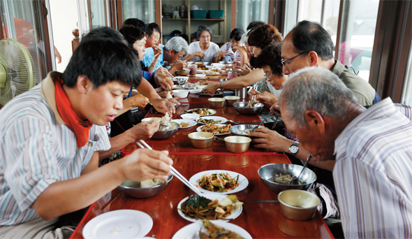 지난 7월18일 용회마을(경남 밀양시 단장면) 사랑방을 꽉 채운 주민·대학생·연대자들이 밥상에 둘러앉아 점심 식사를 하고 있다. 김명진 기자